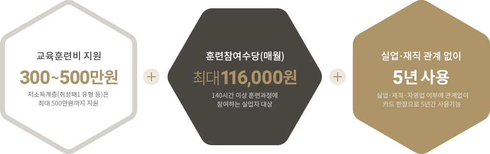 * 실업자,저소득 재직자(근로장려금 수급자)는 140시간 이상 훈련 참여 시 월 최대 116,000원의 훈련장려금 지급국민내일배움카드 지원내용 지원대상 훈련비 지원율 국민내일배움카드 소지자 최대 300만원 한도로 훈련비 45~85% 지원 취업성공패키지 1유형 최대 500만원 한도로 훈련비 50~85% 지원 취업성공패키지 2유형 최대 300만원 한도로 훈련비 80~100% 지원